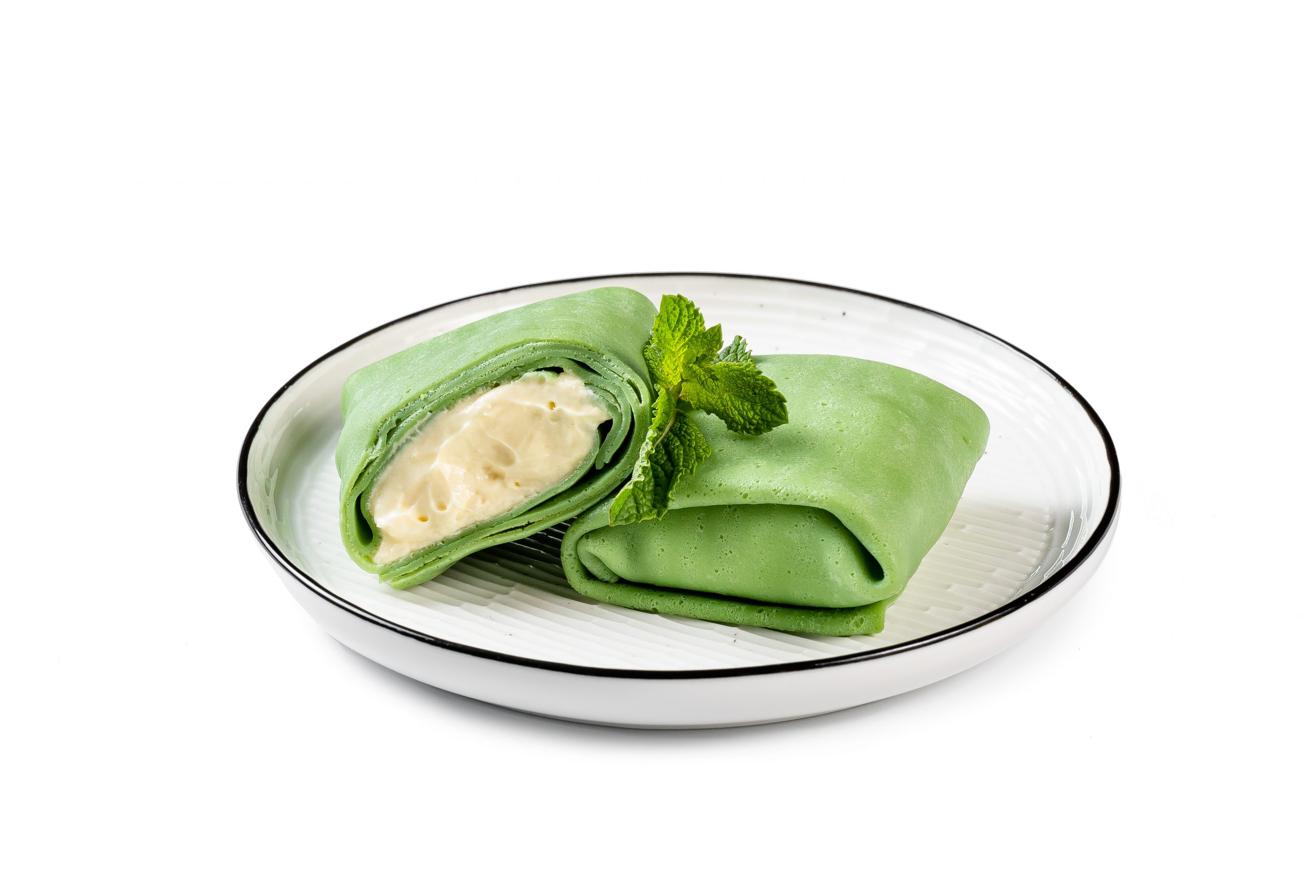 СОСТАВ: начинка (сыр творожный сливочный (обезжиренное молоко, сливки, молочный белок, соль, загуститель камедь рожкового дерева, закваска молочнокислых мезофильно-термофильных культур, молокосвертывающий ферментный препарат микробного происхождения), сахар, масло сливочное, смесь с натуральным лимонным маслом (декстроза, регулятор кислотности лимонная кислота, натуральное лимонное масло, имбирь, пряности, натуральный ароматизатор), соль пищевая, комплексная пищевая добавка (масло рапсовое рафинированное дезодорированное, краситель каротины)), налистник (молоко питьевое, меланж яичный жидкий, мука пшеничная общего назначения, масло подсолнечное рафинированное дезодорированное, сахар, вода питьевая, напиток растворимый сухой «матча латте» (экстракт кокоса сухой, сахар кокосовый, чай зелёный порошковый матча), соль пищевая, экстракт растительный (вода питьевая, экстракты шпината, куркумина), ароматизатор натуральный «чай матча», разрыхлитель гидрокарбонат натрия (сода пищевая), лимонный сок (лимон свежий)).