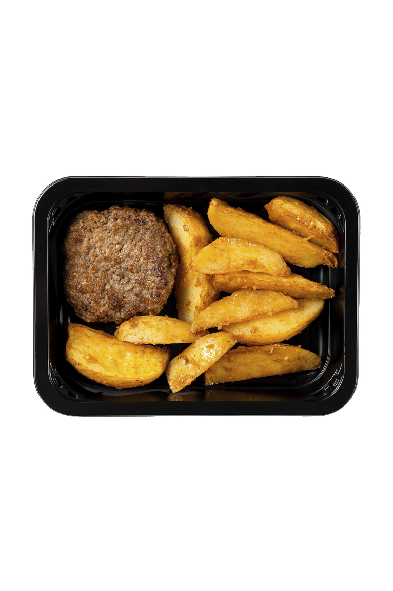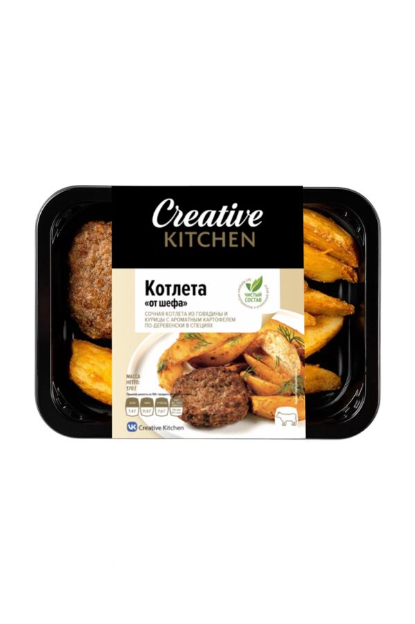 СОСТАВ: картофель по-деревенски (картофель свежий, масло оливковое рафинированное с добавлением масла оливкового нерафинированного, чеснок свежий, масло подсолнечное рафинированное дезодорированное, соль пищевая, розмарин свежий, чеснок сушеный измельченный, смесь пряностей «Хмели-сунели» (кориандр, куркума, пажитник, сахар, зелень петрушки, зелень укропа, перец красный острый, семена укропа, мята, лавровый лист, майоран, чабер), паприка копчёная молотая), котлета от «шефа» (говядина замороженная, окорочок бескостный без кожи замороженный мясо цыплят-бройлеров, лук репчатый свежий, вода питьевая газированная, жир-сырец говяжий замороженный, масло подсолнечное рафинированное дезодорированное, меланж яичный жидкий, соль пищевая, пищевые растительные волокна, перец черный молотый).