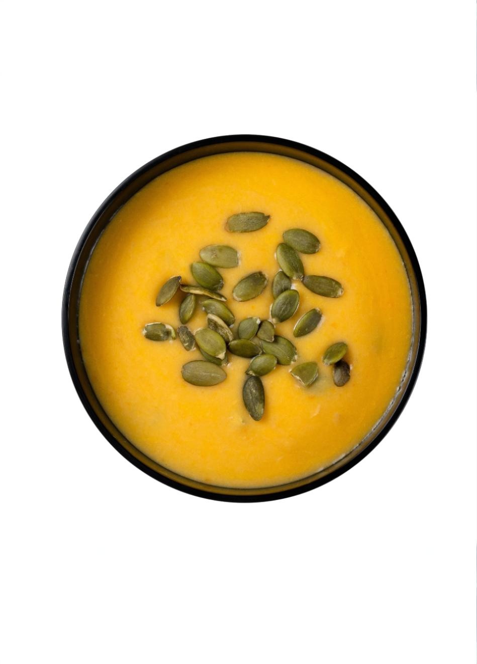СОСТАВ: вода питьевая, морковь столовая свежая, тыква свежая, картофель свежий, креветки белоногие (Litopenaeus vannamei) очищенные (произведено из мороженого сырья, продукция аквакультуры), сливки питьевые, молоко питьевое, стебель сельдерея свежий, лук репчатый свежий, масло подсолнечное рафинированное дезодорированное, семена тыквы очищенные, соль пищевая, корень имбиря свежий, чеснок свежий, куркума молотая, мускатный орех дроблёный, перец черный молотый.