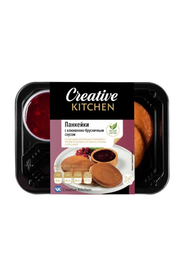 ВОЗДУШНЫЕ ВАНИЛЬНЫЕ ПАНКЕЙКИ С ЯРКИМ ЯГОДНЫМ СОУСОМ ИЗ КЛЮКВЫ И БРУСНИКИ СОСТАВ: панкейки (молоко питьевое, мука пшеничная общего назначения, сахар, масло сливочное, белок яичный жидкий, желток яичный жидкий, сыворотка молочная сухая деминерализованная, масло подсолнечное рафинированное дезодорированное, ванильный сахар (сахар, тростниковый сахар-сырец, экстракт семян ванили, экстракт ванили , лимонный сок свежевыжатый, регулятор кислотности гидрокарбонат натрия (сода пищевая)), клюквенно-брусничный соус (клюква замороженная, сахар, брусника замороженная, вода питьевая, крахмал кукурузный).