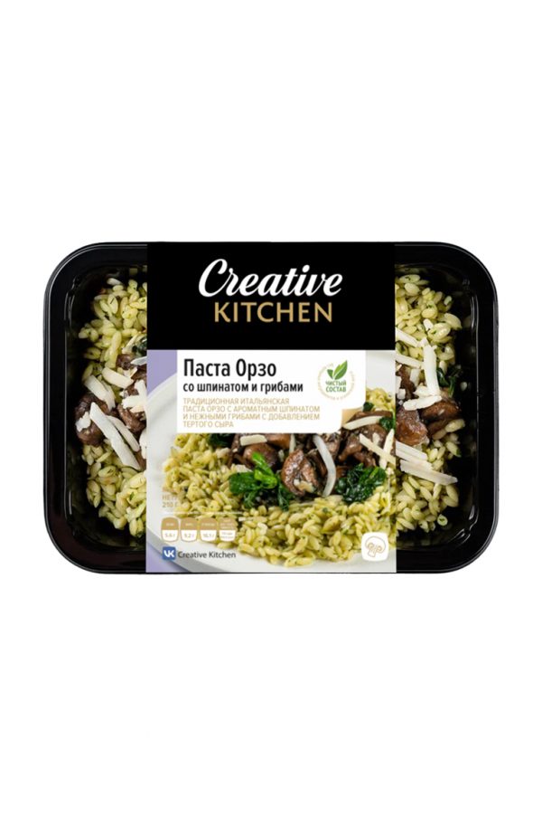 СОСТАВ: паста Орзо отварная (вода питьевая, макаронные изделия из твердых сортов пшеницы (мука из твердых сортов пшеницы, вода питьевая), масло подсолнечное рафинированное дезодорированное, соль пищевая), шампиньоны свежие, сыр твёрдый (молоко нормализованное пастеризованное, соль пищевая, закваска культур молочнокислых микроорганизмов, молокосвёртывающий ферментный препарат микробного происхождения, уплотнитель – хлорид кальция), масло подсолнечное рафинированное дезодорированное, масло сливочное, масло оливковое рафинированное, шпинат свежий, петрушка свежая зелень, зелень укропа свежая, арахис жареный дробленый, базилик свежий, соль пищевая, чеснок свежий, грибы белые сушеные измельченные.