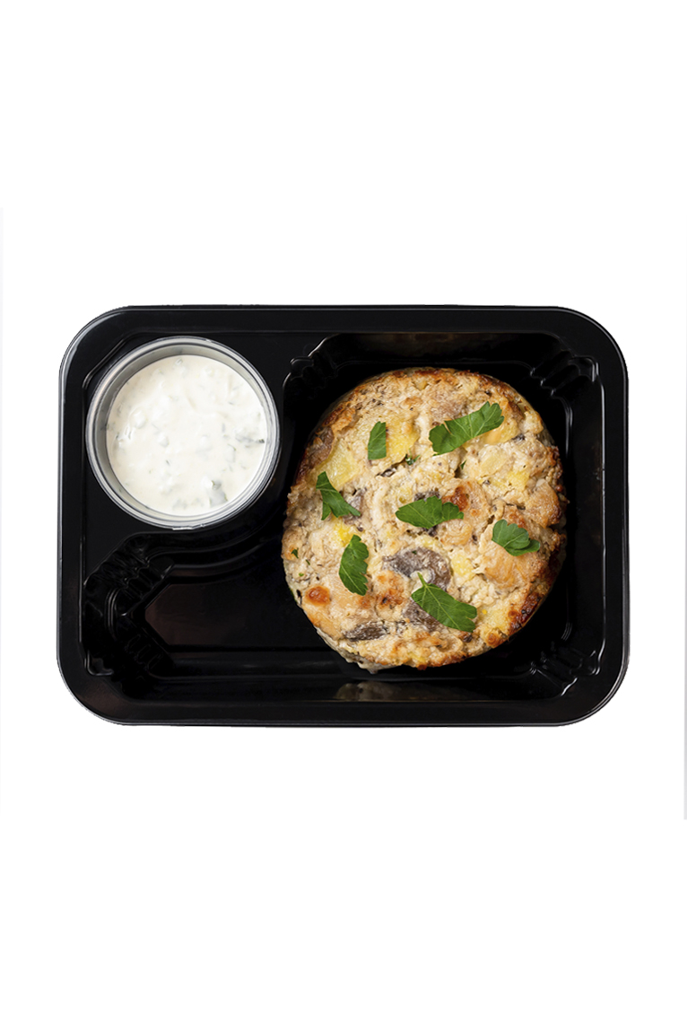 СОСТАВ: запеканка (картофель свежий, сливки питьевые, окорочок бескостный без кожи (мясо цыплят бройлеров), лук репчатый свежий, грибы шампиньоны свежие, масло подсолнечное рафинированное дезодорированное, сыр Моцарелла (молоко пастеризованное и нормализованное, термофильная молочнокислая закваска, молокосвёртывающий ферментный препарат животного происхождения, соль пищевая), сыр «Пармезан» (молоко нормализованное пастеризованное, соль пищевая, закваска культур молочнокислых микроорганизмов, молокосвёртывающий ферментный препарат микробного происхождения, уплотнитель хлорид кальция), мука пшеничная, масло сливочное, соль пищевая, бульон куриный сухой (соль пищевая, декстроза, экстракты специи (целер), куриный жир, растительный кукурузный белок, экстракт квасника, специи, рапсовый лецитин), грибы белые сушеные измельченные, чеснок сушеный измельченный, перец душистый молотый, приправа итальянские травы (орегано, базилик, майоран, розмарин, чабер садовый, тимьян, шалфей)), соус (майонез (масло подсолнечное рафинированное дезодорированное, вода питьевая, сахар, жидкий яичный желток, соль пищевая, уксус спиртовой, горчичное масло нерафинированное), йогурт (молоко цельное, молоко обезжиренное восстановленное, йогуртовая закваска (термофильные молочнокислые стрептококки, болгарская палочка), базилик свежий, чеснок свежий, укроп свежий, петрушка свежая), петушка свежая. Будьте внимательны! Возможно попадание косточки!